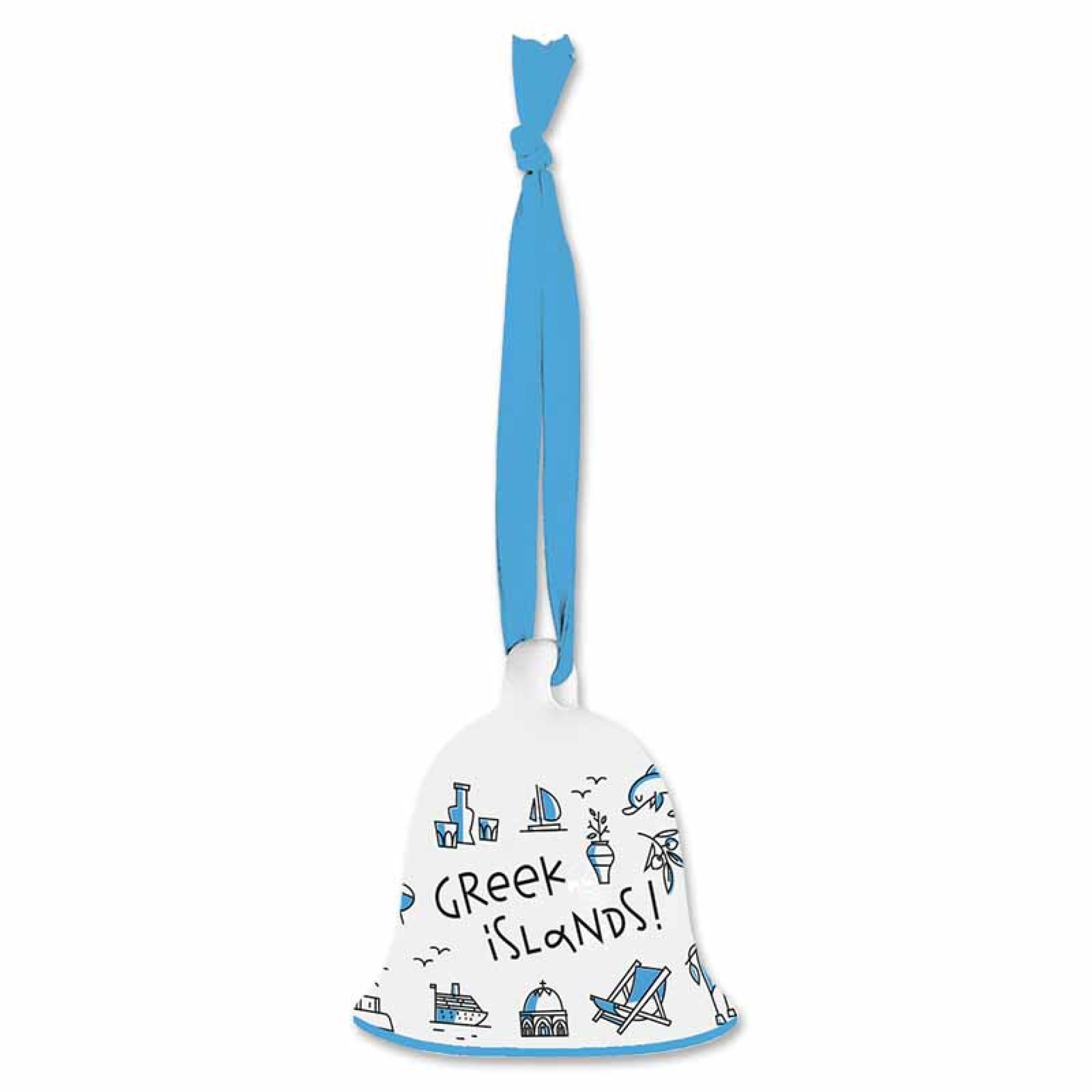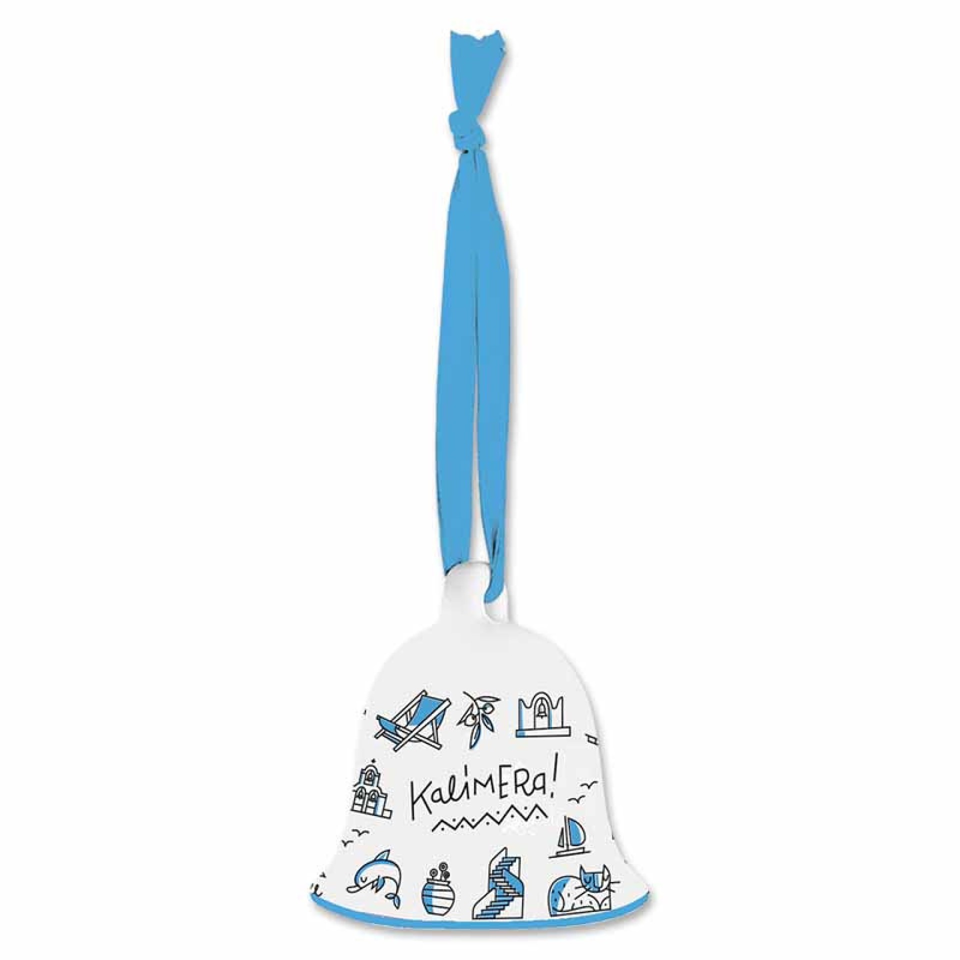 Κεραμική χριστουγεννιάτικη καμπανούλα με γαλάζια κορδέλα και χαριτωμένα σκίτσα εμπνευσμένα από τα Ελληνικά νησιά. Απεικονίζει παραθαλάσσιες σκηνές, εκκλησάκια με μπλε τρούλους, καΐκια, γαϊδουράκι, γάτες και τη λέξη Kalimera! / Greek Islands!, σε fresh καλοκαιρινό στιλ. Ιδανικό αναμνηστικό και διακοσμητικό στολίδι που φέρνει άρωμα Ελλάδας στο Χριστουγεννιάτικο δέντρο. Διάμετρος: 6.5 cm