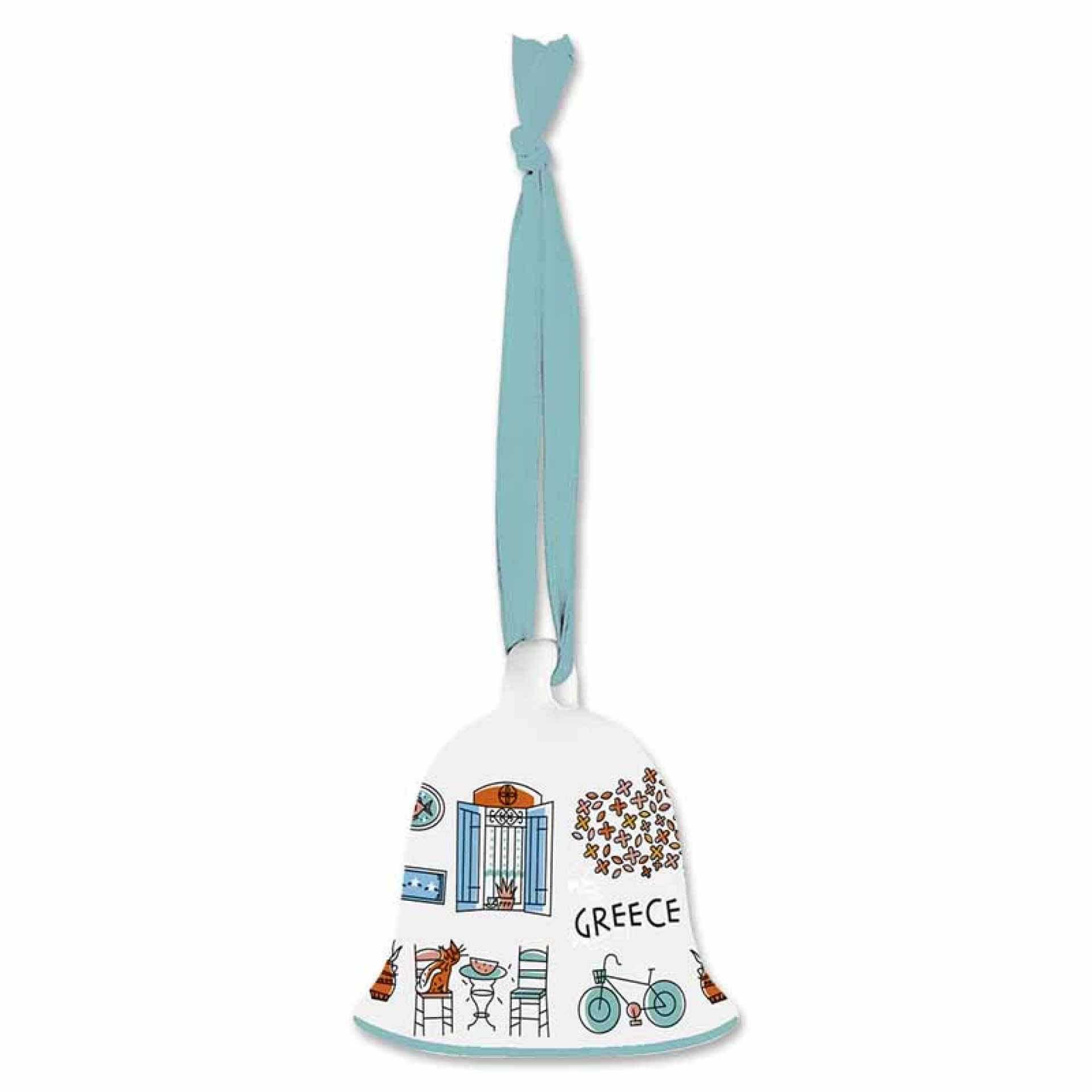 Κεραμικό χριστουγεννιάτικο καμπανάκι με ζωγραφισμένο γραφικό ελληνικό καφενείο, πόρτα με παραθυρόφυλλα, γάτες, ποδήλατο και λουλούδια bougainvillea. Φρέσκο, νησιώτικο σχέδιο που αποπνέει την αυθεντική ελληνική φιλοξενία και το «Kalimera» των Κυκλάδων. Διακοσμημένο με κορδέλα σε απαλό γαλάζιο για εύκολη ανάρτηση στο δέντρο ή στο σπίτι. Διάμετρος: 6.5 cm