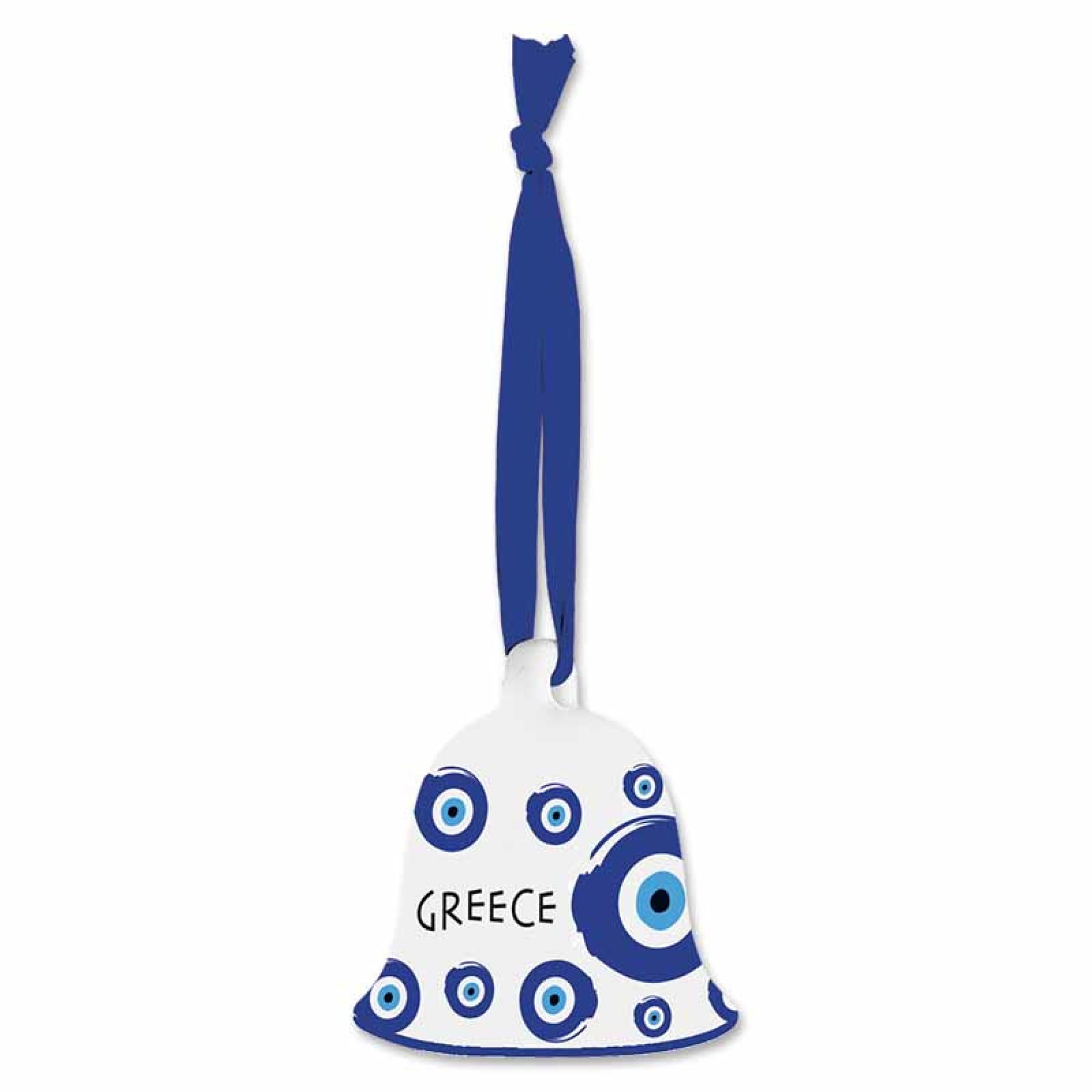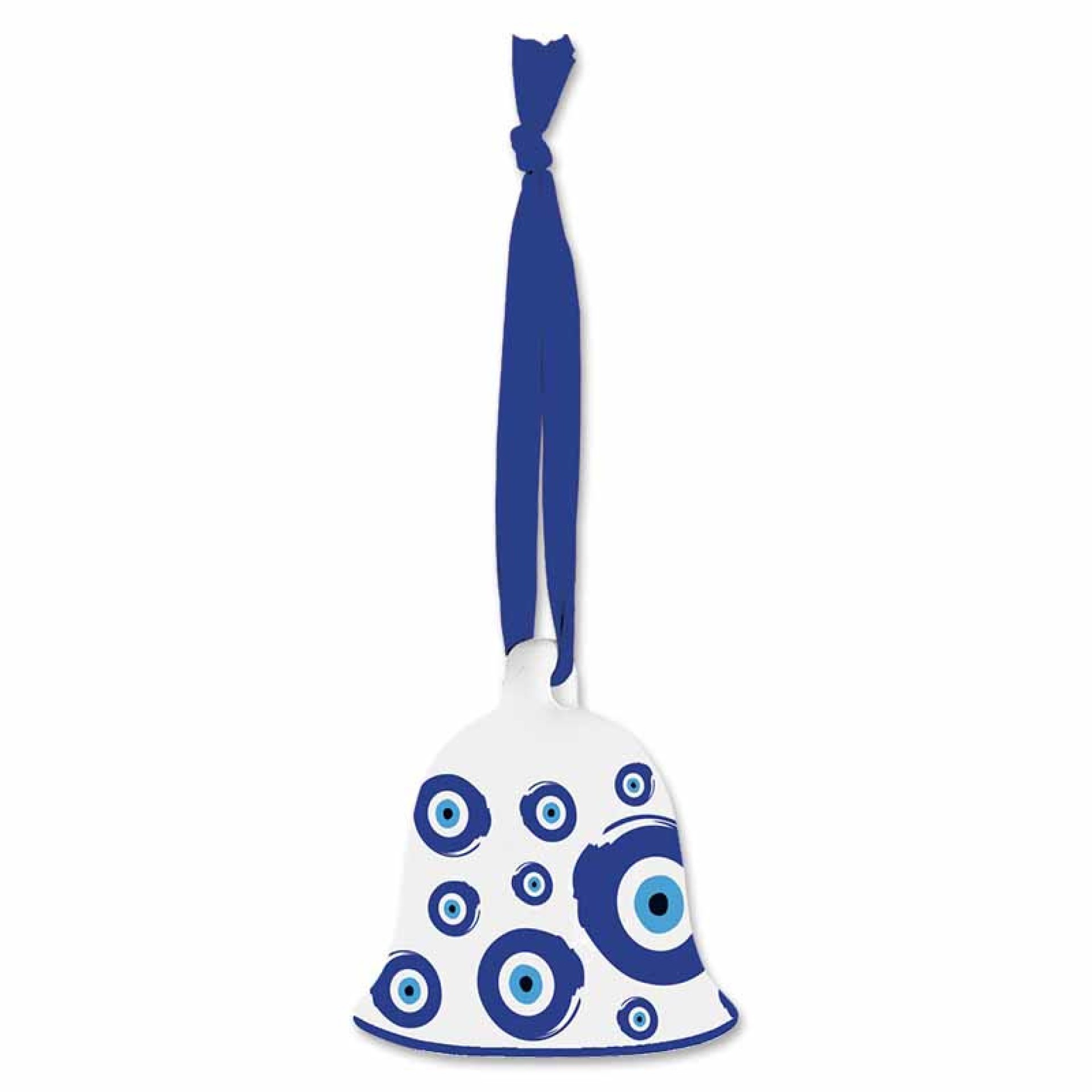 Κεραμικό χριστουγεννιάτικο καμπανάκι με σχέδιο «μάτι» (evil eye), εμπνευσμένο από την ελληνική παράδοση για καλή τύχη και προστασία. Διακοσμημένο με μοντέρνο μοτίβο μπλε ματιών και κορδέλα σε βαθύ μπλε χρώμα για κρέμασμα. Ένα μοναδικό, γουράκι-στολίδι που φέρνει Ελλάδα στα Χριστούγεννα σας!