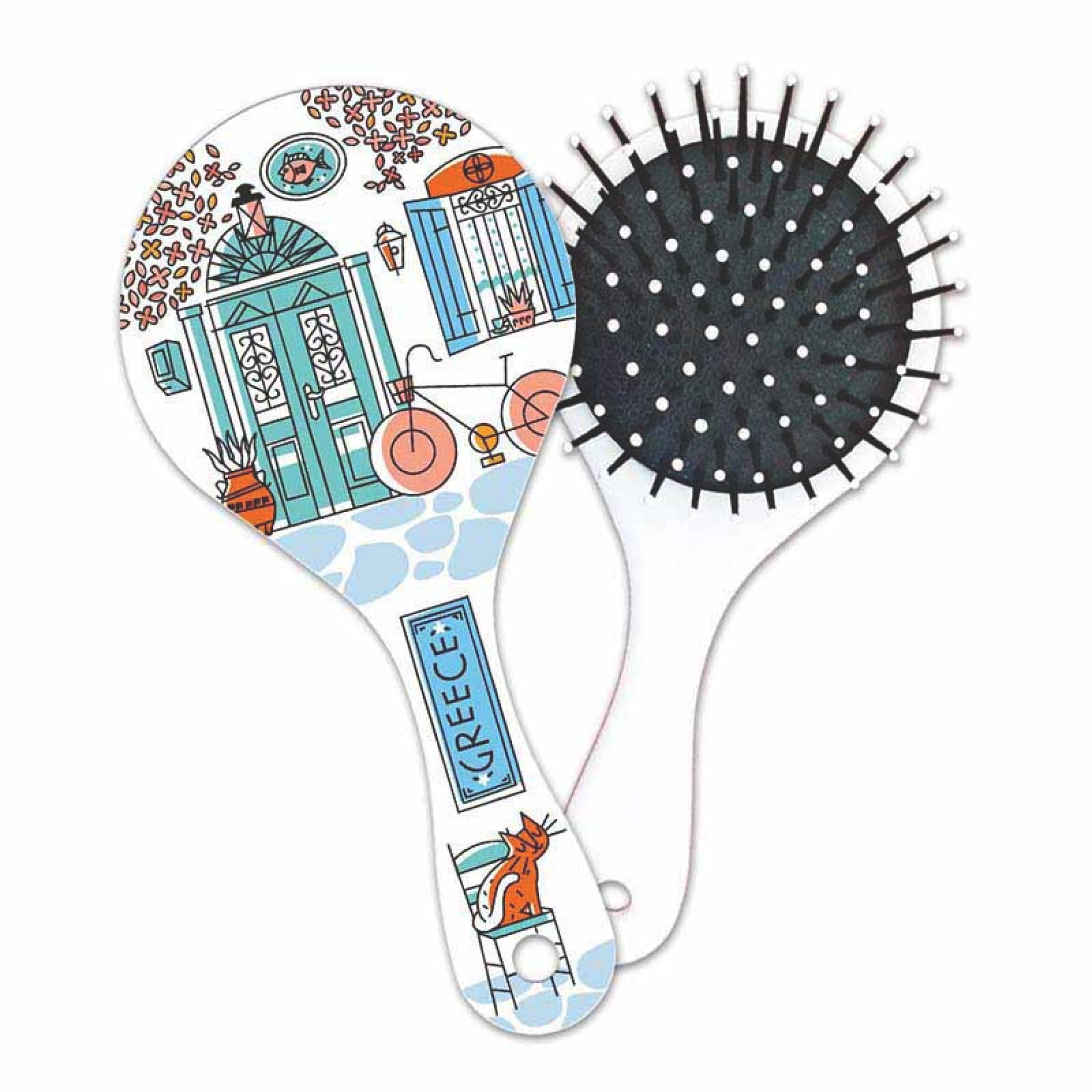 Η Βούρτσα Μαλλιών GREECE Καφενείο είναι εμπνευσμένη από τη γοητεία των ελληνικών καφενείων – τα χρωματιστά παραθυρόφυλλα, τα ποδήλατα και τις γάτες που απολαμβάνουν τον ήλιο στα πλακόστρωτα σοκάκια.