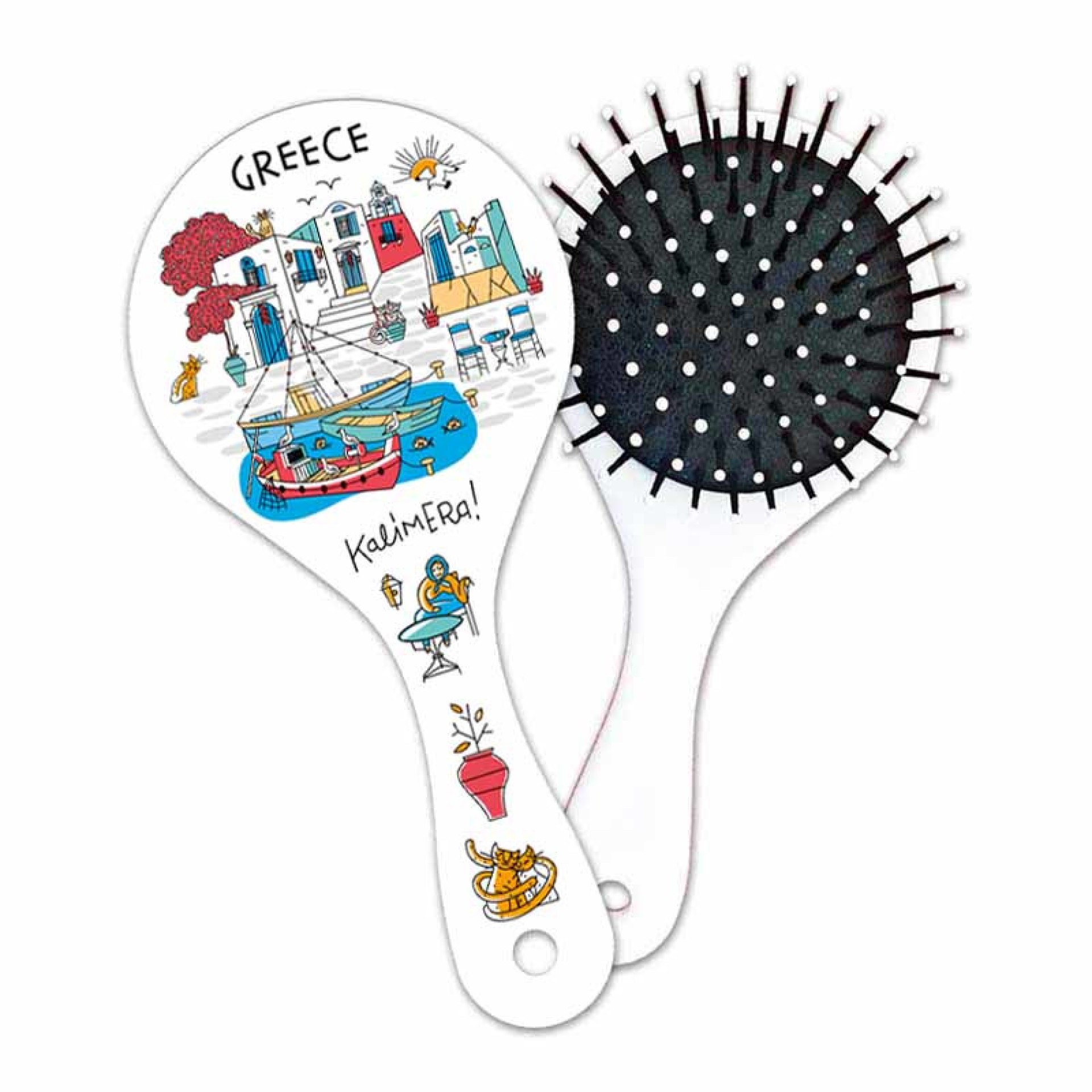Η Βούρτσα Μαλλιών GREECE Καραβάκι φέρνει στο νου τις όμορφες εικόνες των ελληνικών νησιών, με τα παραθαλάσσια χωριά, τα ψαροκάικα και τα λευκά σπιτάκια που λούζονται στο φως του ήλιου. Με τη χαριτωμένη επιγραφή “Kalimera!” και ζωηρά χρώματα, αποπνέει θετική διάθεση και καλοκαιρινό αέρα. Οι μαλακές στρογγυλές άκρες της προστατεύουν τα μαλλιά από το σπάσιμο και το τράβηγμα, ενώ η εργονομική λαβή προσφέρει άνετο και σταθερό κράτημα. Ιδανική για καθημερινή χρήση ή ως μοναδικό ελληνικό σουβενίρ! Χαρακτηριστικά: Διαστάσεις: 17 × 7,9 εκ. Υλικό: Ανθεκτικό πλαστικό Εργονομική λαβή Μαλακές, στρογγυλές άκρες για εύκολο ξεμπέρδεμα Σχέδιο: Boats – Ελληνικό λιμανάκι με βάρκες και σπίτια Ιδανική για χρήση στο σπίτι, στο ταξίδι ή ως δώρο