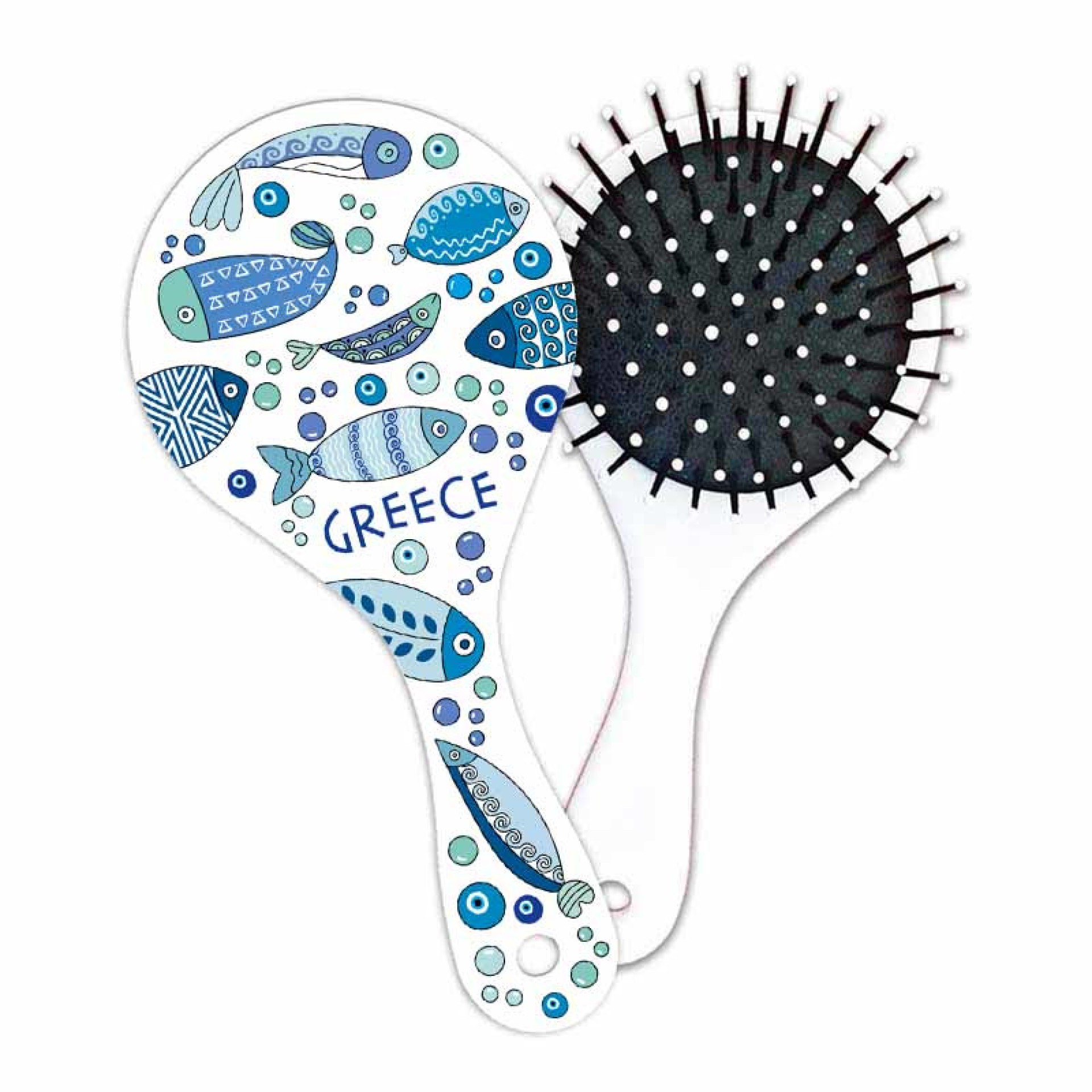 Η Βούρτσα Μαλλιών GREECE Ψάρια είναι εμπνευσμένη από τη θαλάσσια αύρα και τη μαγεία των ελληνικών νησιών. Με γαλάζια ψαράκια και μοτίβα ματιών, αποπνέει φρεσκάδα, τύχη και καλοκαιρινή διάθεση! Οι μαλακές στρογγυλές άκρες της προστατεύουν τα μαλλιά και το τριχωτό της κεφαλής, ενώ η εργονομική λαβή προσφέρει άνεση στη χρήση. Ιδανική για καθημερινή περιποίηση, ταξίδι ή ως μοναδικό αναμνηστικό από την Ελλάδα. Χαρακτηριστικά: Διαστάσεις: 17 × 7,9 εκ. Υλικό: Ανθεκτικό πλαστικό Μαλακές στρογγυλές άκρες για ανώδυνο ξεμπέρδεμα Εργονομική λαβή Σχέδιο: Γαλάζια ψαράκια & ελληνικά μοτίβα Ιδανική για χρήση στο σπίτι ή ως δώρο