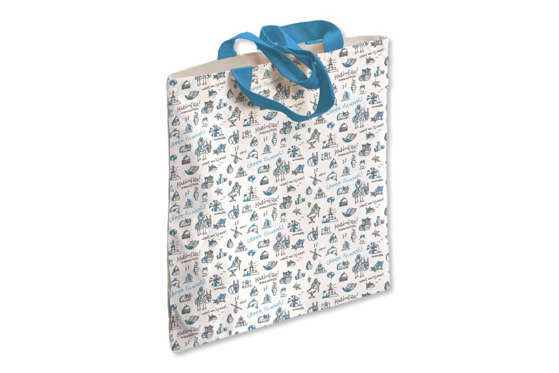 Με σχέδια που θυμίζουν τις πιο χαρακτηριστικές εικόνες της Ελλάδας — ανεμόμυλους, εκκλησάκια, γάτες, καΐκια και τη φράση “Kalimera!” — αυτή η τσάντα φέρνει μαζί της τον ήλιο, τη θάλασσα και τη χαλαρή νησιώτικη διάθεση.