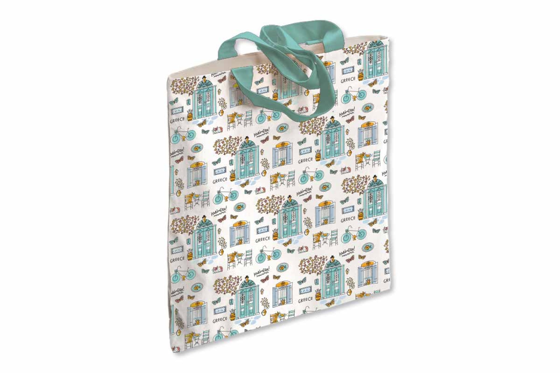 Μια τσάντα που αποπνέει τη χαλαρή και φιλόξενη ατμόσφαιρα της Ελλάδας! Εμπνευσμένη από τις αυθεντικές γωνιές των ελληνικών καφενείων, με ζωγραφιστές πόρτες, γλάστρες, καρέκλες, γάτες και το χαρακτηριστικό «Kalimera!» να καλωσορίζει τη μέρα. Οι απαλοί τόνοι του τιρκουάζ και της ώχρας δημιουργούν μια ρομαντική και καλλιτεχνική διάθεση. Ανθεκτική, ελαφριά και πρακτική, ιδανική για τις βόλτες σας, τα καθημερινά ψώνια ή ως καλοκαιρινό σουβενίρ. Μια μικρή δόση ελληνικής καθημερινότητας γεμάτη χρώμα και χαμόγελο! Διαστάσεις: 43 X 38 cm