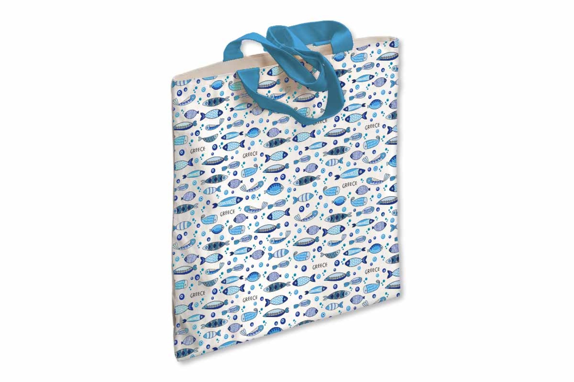 Μια παιχνιδιάρικη και καλοκαιρινή τσάντα γεμάτη ελληνική θάλασσα! Το μοτίβο με τα μπλε ψαράκια, εμπνευσμένο από την παραδοσιακή τέχνη και τα νησιώτικα χρώματα, αποπνέει ανεμελιά και θετική ενέργεια. Απαλές αποχρώσεις του γαλάζιου, του μπλε και του λευκού συνδυάζονται αρμονικά, θυμίζοντας ήλιο, κύμα και αλμύρα. Ιδανική για καθημερινή χρήση, για την παραλία ή ως μοναδικό αναμνηστικό από την Ελλάδα. Μια τσάντα γεμάτη καλοκαίρι και θαλασσινή διάθεση! Διαστάσεις: 43 X 38 cm
